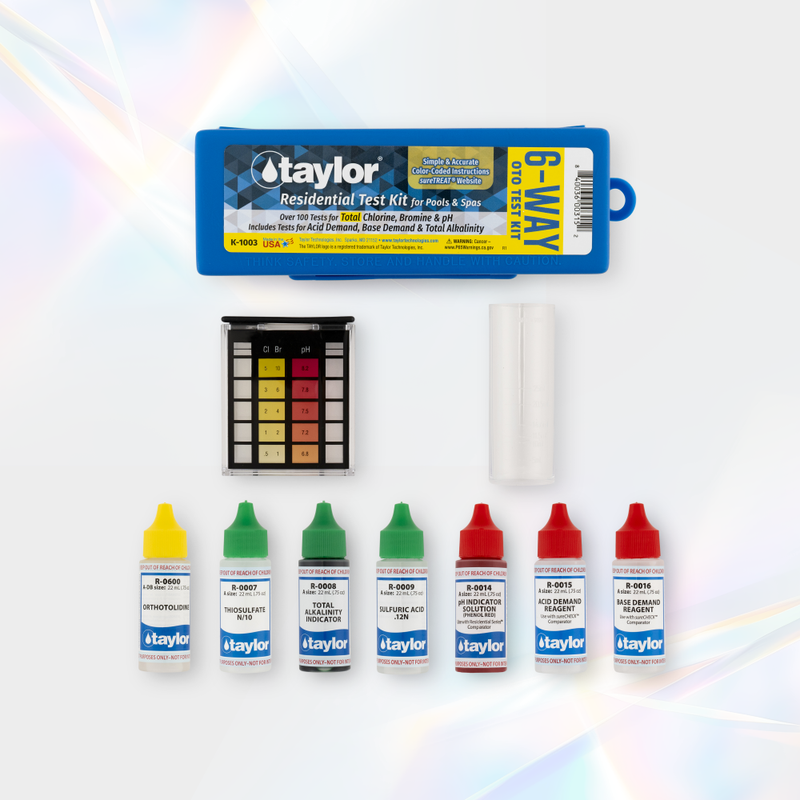 Taylor® K-1003 6-Way Test Kits provide accurate results for essential water quality parameters to help ensure balanced and clear pool or spa water. Designed with simplicity in mind, this kit makes routine testing quick and straightforward.